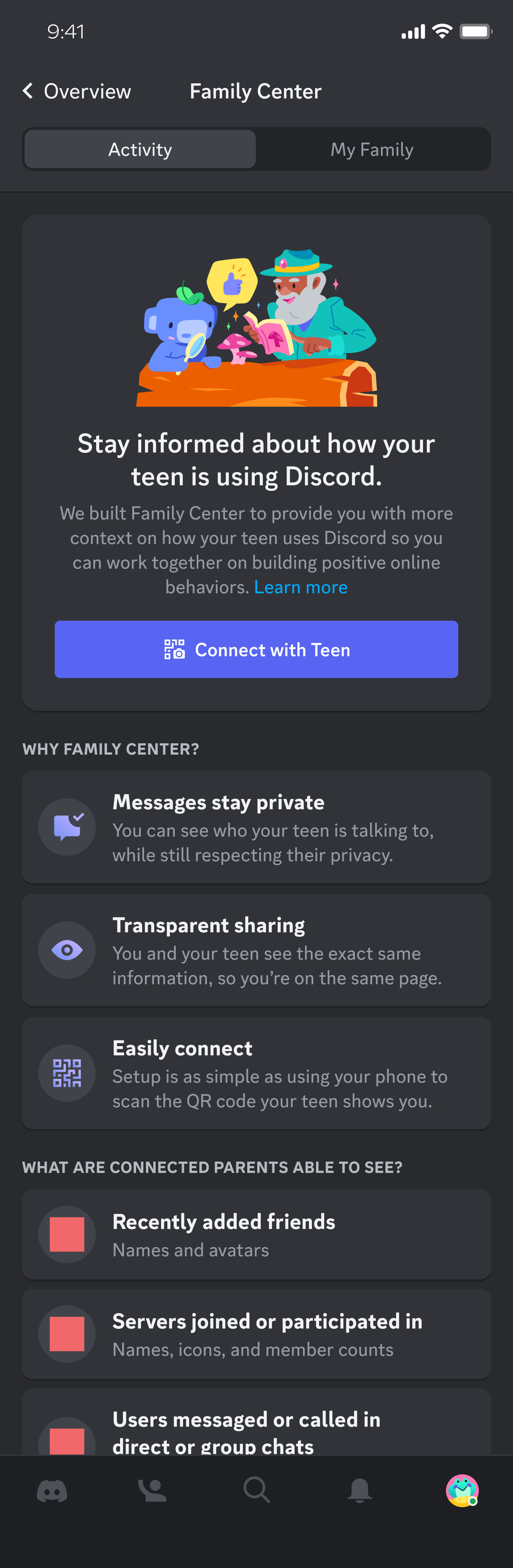 Family Center helps parents and teens navigate discord with proper internet guidance and safety. Not only did we manage fill a gap in Discords platform safety but propel the companies image as a trusted partner in internet safety for parents and teens.